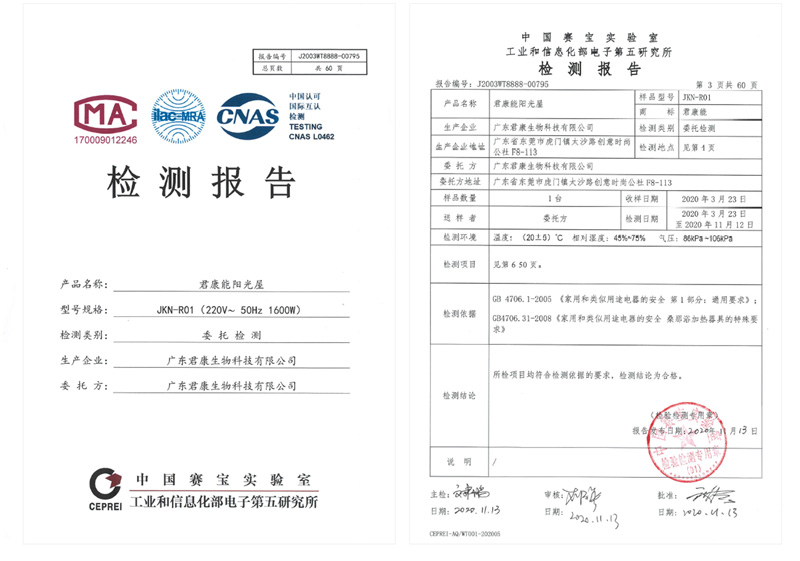 君康能阳光屋的产品硬实力,得到了赛宝实验室的高度认可!通过GB4706.1-2005和GB4706.31-2008通标要求和特殊要求双标检测更严格也更专业!