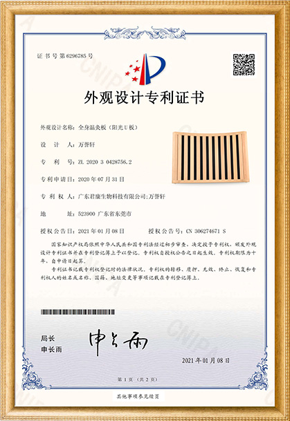 “君康能阳光U板”获得国家知识产权局颁发的“外观设计专利证书”实用新型专利证书!