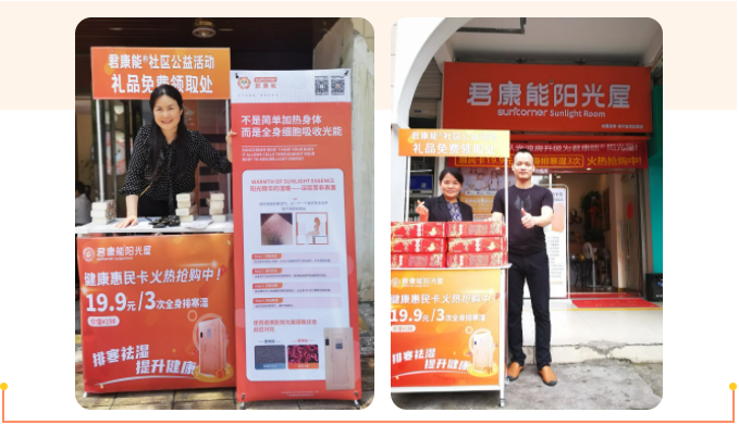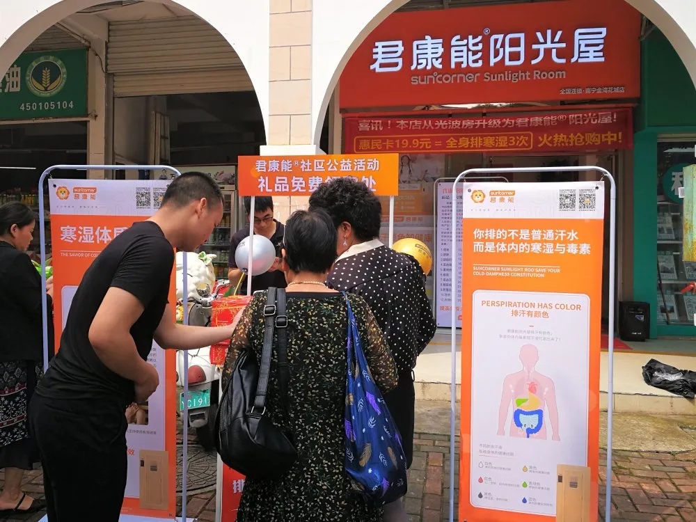 为让更多的亚健康人群,可以感受到排寒祛湿对身体健康带来的好处,君康能不定期在全国各地区开展社区惠民活动,让更多社区居民认识并体验君康能阳光屋。