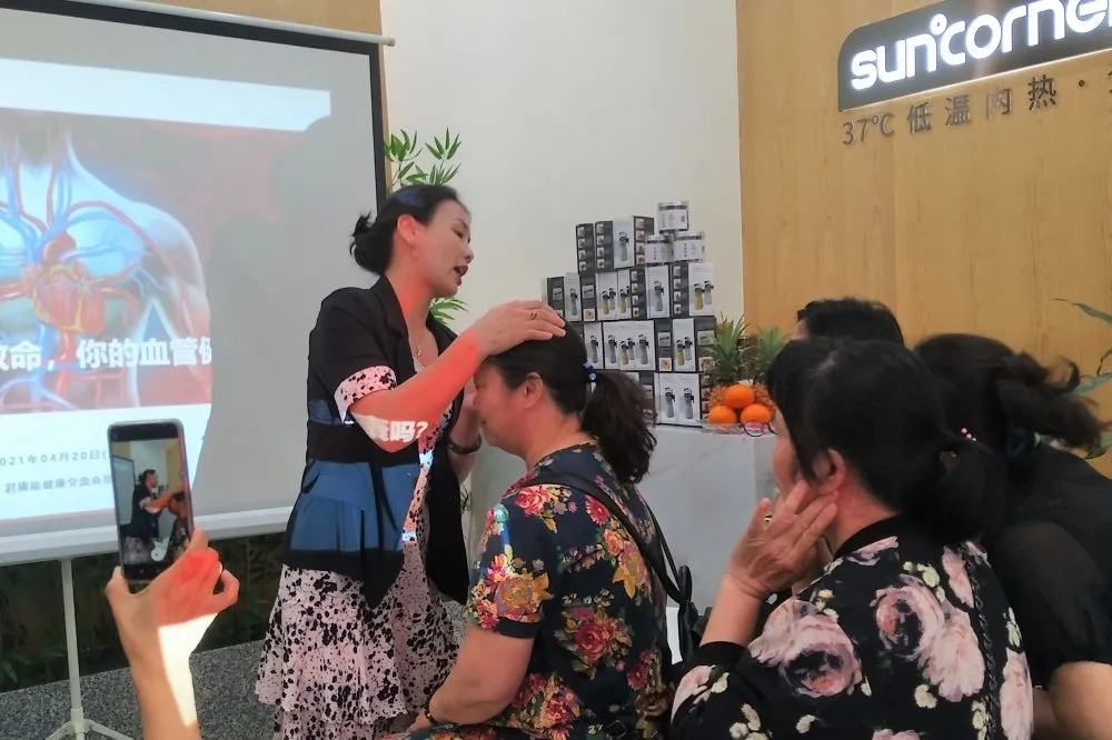 在讲座正式开始前,主持人市场部经理欧兰先给现场粉丝展示了如何按摩面部及头部穴位,疏通经络;还现场给粉丝按摩,让粉丝亲身体验效果。