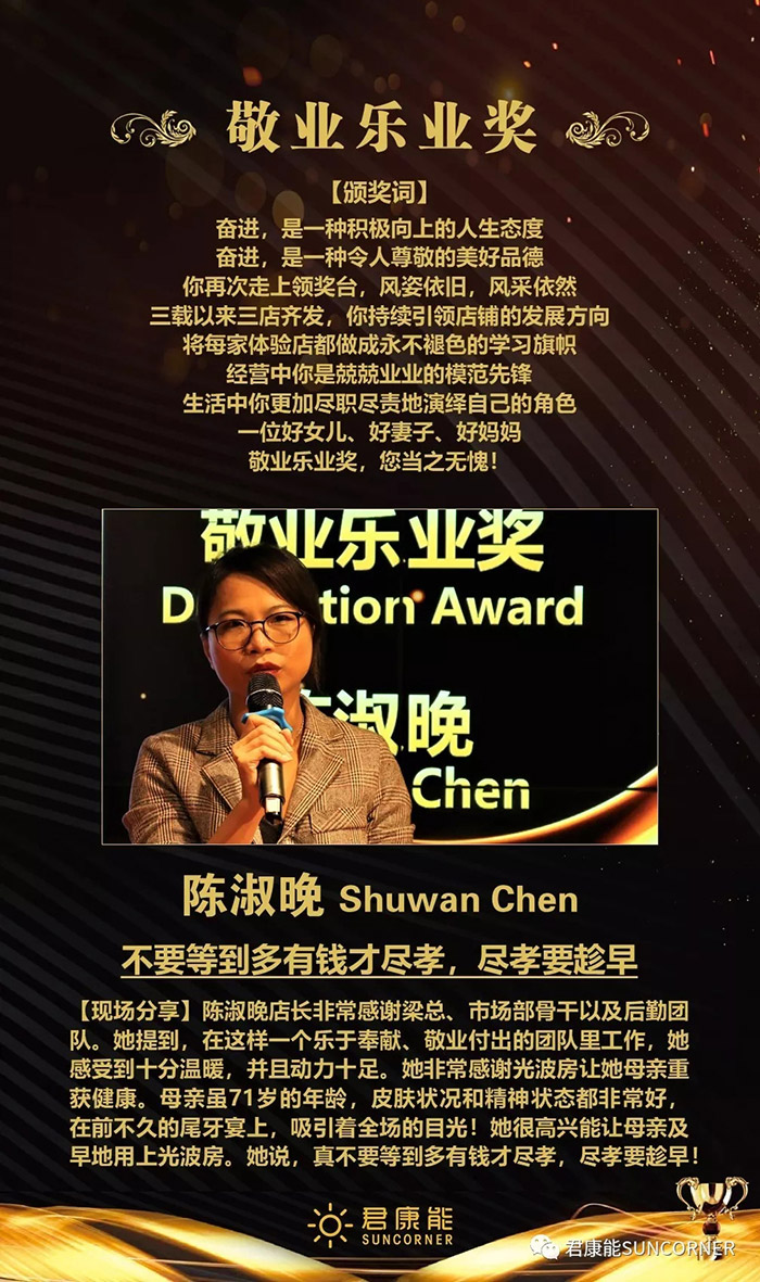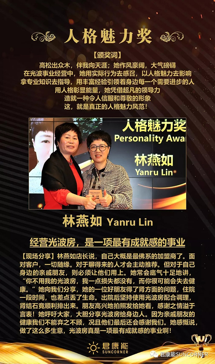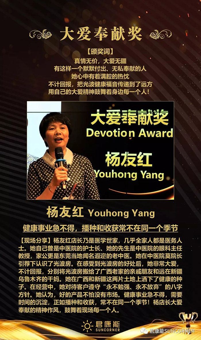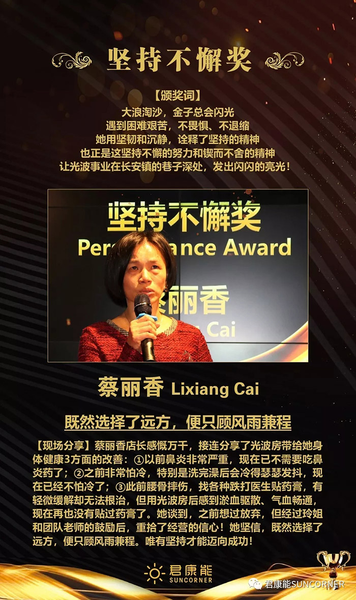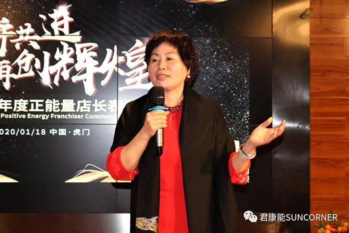 她号召大家,在新的一年里,不骄傲、不懈怠,脚踏实地、不忘初心!给想发展事业的人以事业,给想收获健康的人以健康。用真正的好产品,匹配上专业的好服务,将光波健康和正能量带给更多的客户朋友!