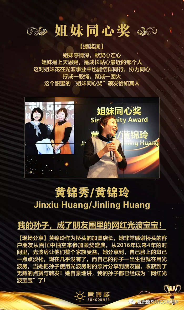 玲姐讲述了在过去一年中家人们拼搏、奋进、相互关怀、互帮互助的感人过往,一份份回忆令在场所有人都深受感动。 她非常感恩许多老光波用户们15年来的陪伴,也讲述了15年前在贵人引荐下遇到光波房项目的历程。她遥祝老朋友在新的一年里越来越好,在光波行业中并肩作战,共同努力让更多有缘人认知并用上光波房!