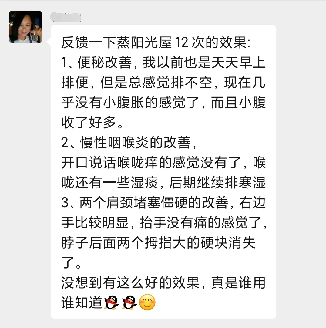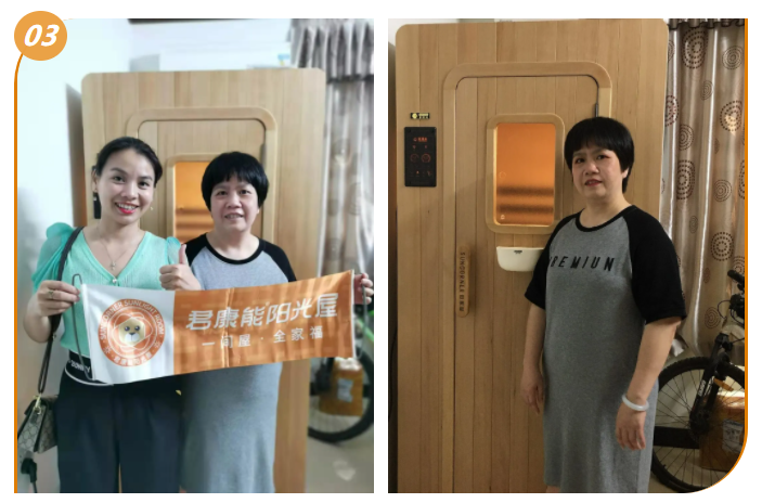 图片东莞长安的婵姐,自己并没有体验过阳光屋,而她的一个好朋友使用阳光屋已经一年多了,效果非常不错。婵姐出于对朋友的信任,更为了给家人带去健康,毫不犹豫地就将阳光屋搬回家。