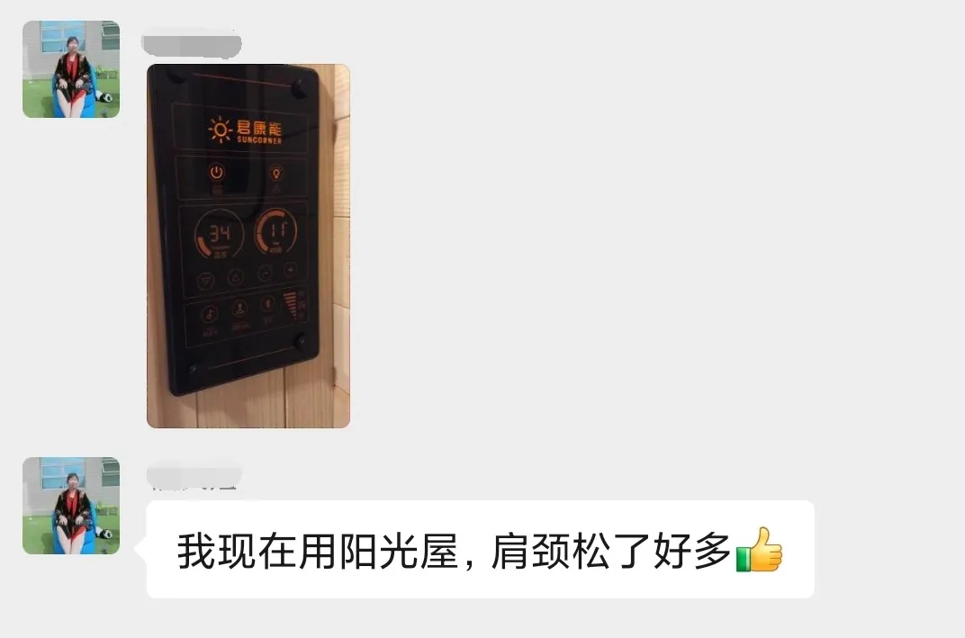 图片东莞虎门梁女士身边已经有十多个朋友用上了君康能阳光屋,大家对阳光屋的评价都非常好!在朋友的感染下,同时也为了方便调理颈椎疼痛和内分泌失调的问题,她果断将阳光屋搬回家,不仅仅方便了自己调理身体,更把健康带给了全家人!