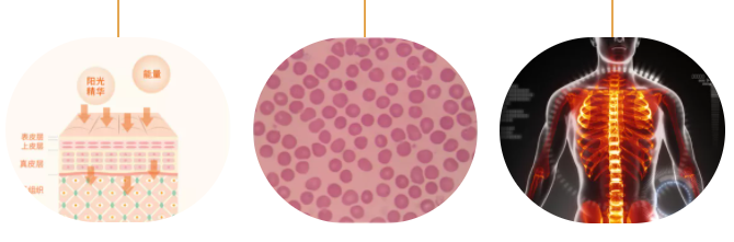 阳光精华能渗透人体皮肤4~5公分,直接作用于深层组织,补充细胞能量,并且与细胞产生同频共振,使细胞吸足能量,体内温度提升,进而产生温热效应,此时体内组织血液流量增加、血流速度增快、微血管扩张、细胞代谢增强,从而使微循环得到改善,免疫力得到提高。
