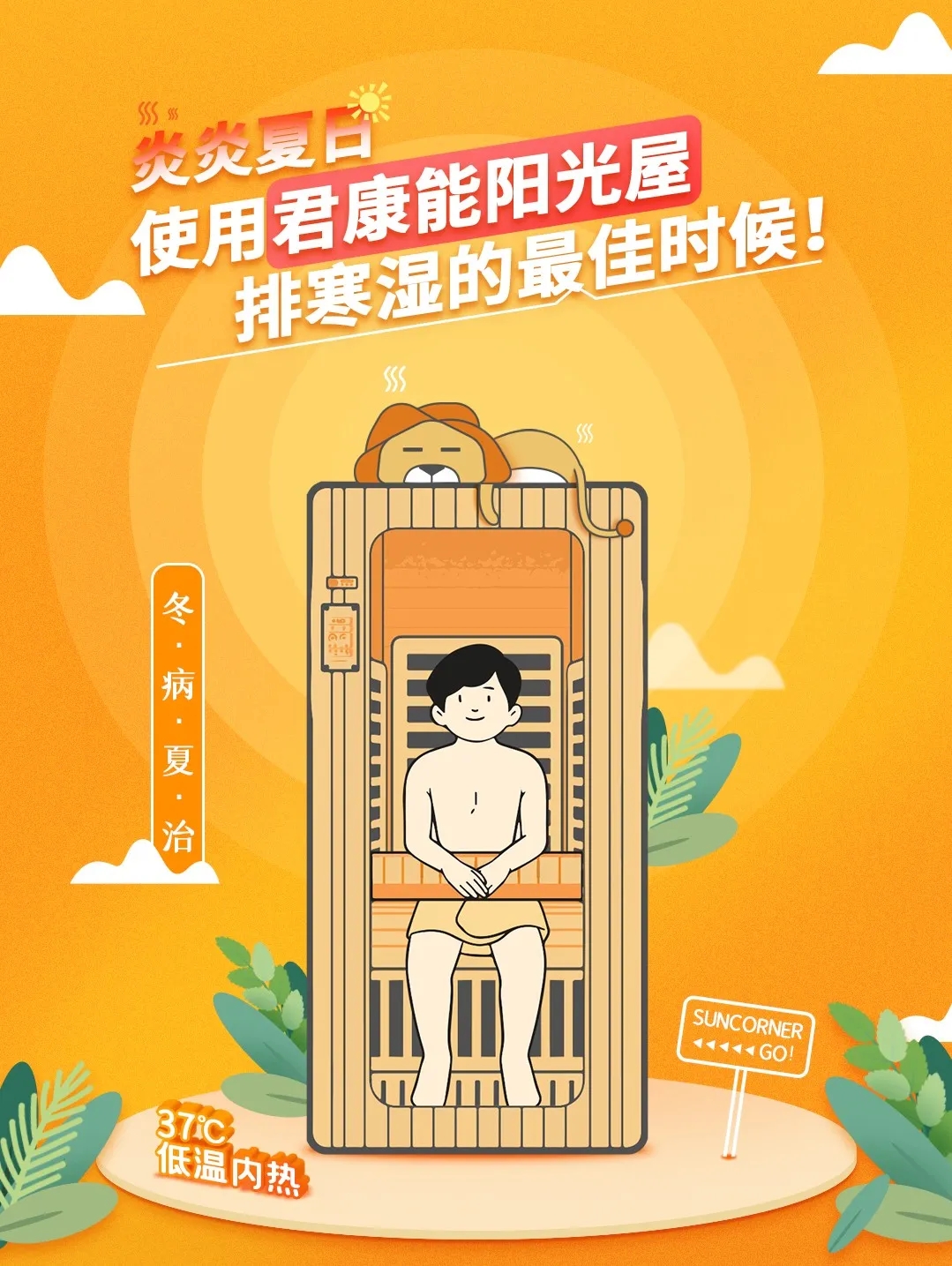 趁着炎炎夏日来临之际,坚持连续使用君康能阳光屋,让“天时之热”与“人体内热”,双热夹击,将你体内最深层的寒湿气彻彻底底地排出体外!