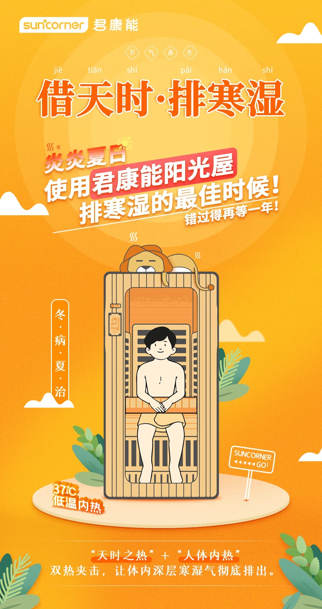 这时,你一定要听狮子君的话:趁着炎炎夏日来临之际,坚持连续使用君康能阳光屋,让“天时之热”与“人体内热”,双热夹击,将你体内最深层的寒湿气彻彻底底地排出体外!