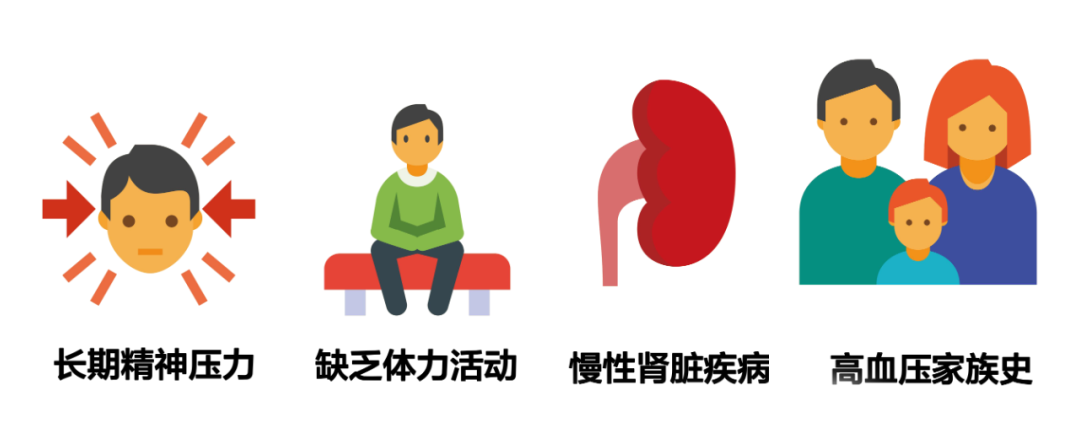 高血压受年龄、遗传、肥胖、环境等多种因素的影响。可大体归为以下五大类: