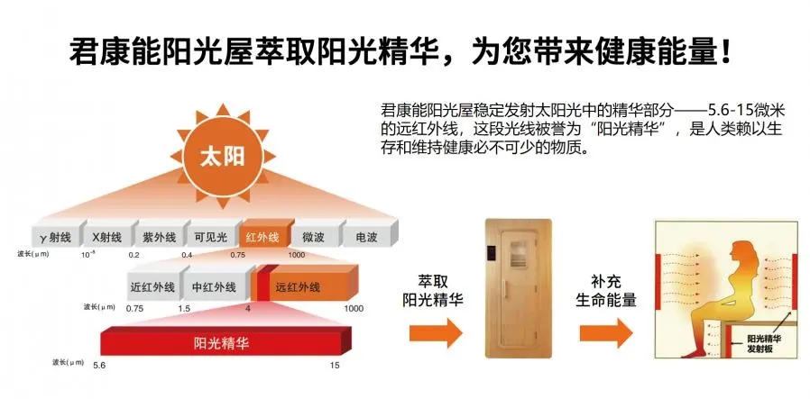 8.每天20-30分钟君康能阳光屋。君康能阳光屋萃取远红外线中5.6~15微米的阳光精华,能穿透人体皮肤4-5公分,直接作用于深层组织,活化细胞,细胞吸收阳光精华的能量使人体内热升温,增强机体新陈代谢,大量出汗,达到运动效果。