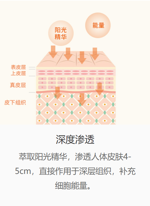 阳光精华能渗透人体皮肤4~5cm,直接作用于深层组织,补充细胞能量。