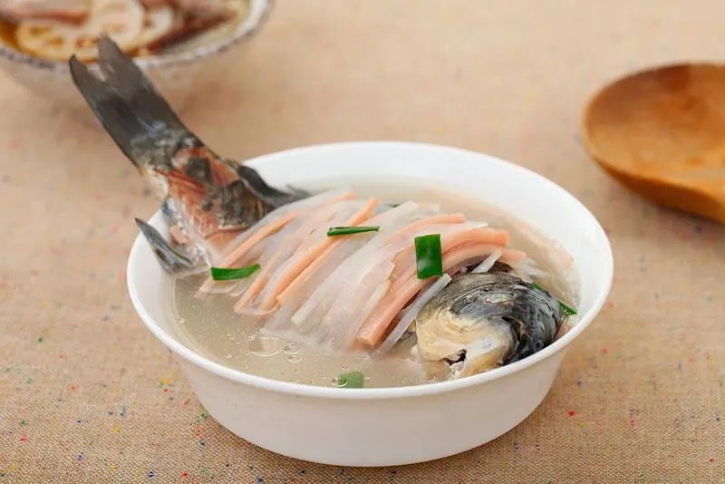 制作:将鲫鱼剖除内脏,洗干净;黄芪切片,与枳壳一起用纱布袋装好,扎紧口;生姜、细葱洗净切碎。先将药袋入锅,加水适量,煮约半小时,再下鲫鱼同煮,待鱼熟后,捞去药袋,加入姜、葱、精盐、味精调味即成。