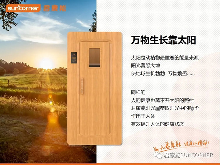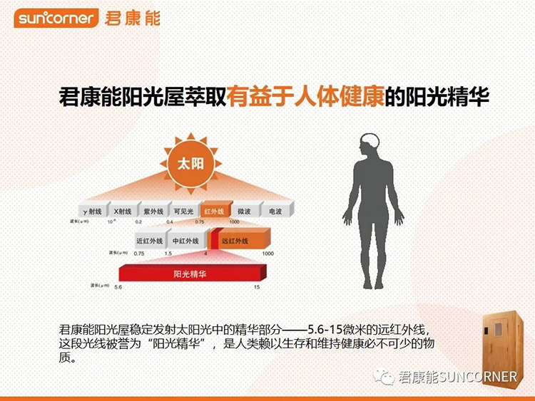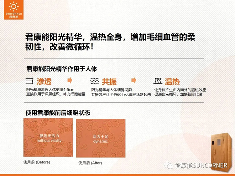君康能阳光屋稳定发射5.6-15微米的阳光精华,当阳光精华照射到人体时,体内细胞和水分子会发生振动,这种振动方式有上下运动和旋转运动等形式,能对细胞产生轻微的活化作用,从而达到活化细胞的作用,细胞吸收能量并提升人体温度,进而引起体内组织血流量增加、血流速度增快,五脏六腑温度提升,从而加快乙醇的分解代谢,保护脏腑,使人神清气爽。同时还能将酒的寒湿之气排出体外。