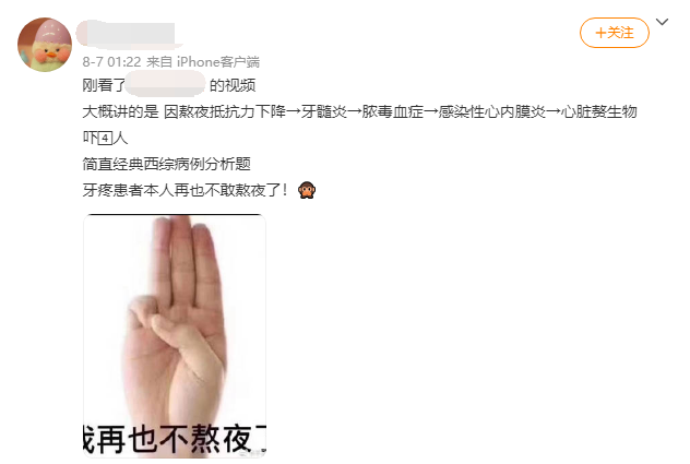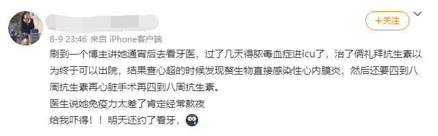 ▽这位博主因为在熬夜后的第二天去小诊所看牙医,结果细菌感染,得了脓毒症,还演变成脓毒性休克。