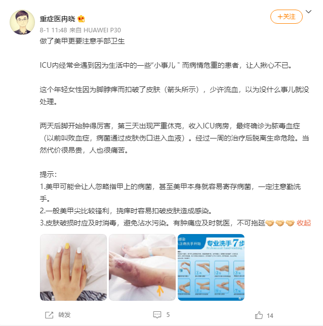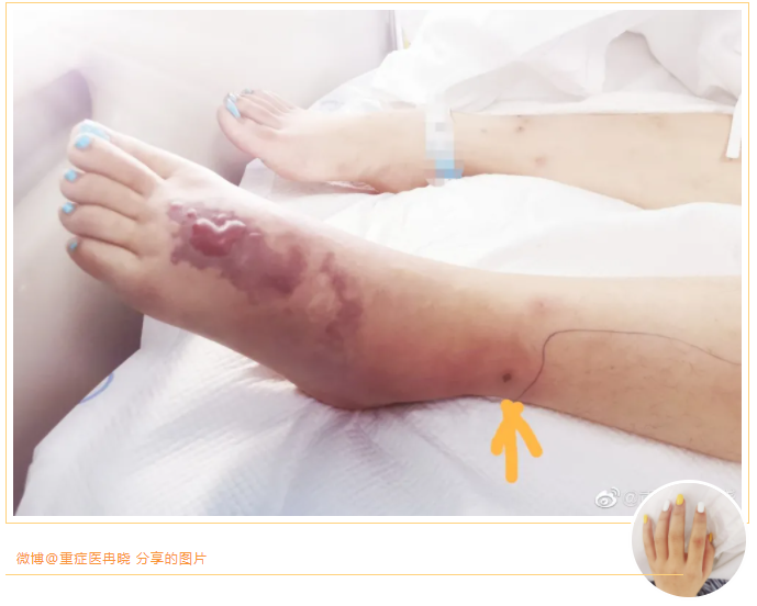 ▽一位年轻女性做美甲后,因为脚脖子痒去抓挠,抓破了皮肤,结果两天后脚部肿得厉害,第三天出现了严重休克,最终确诊为脓毒血症。
