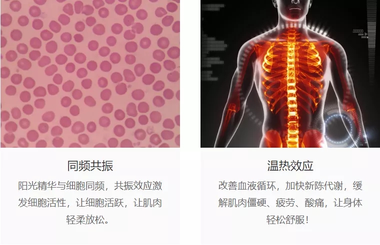 阳光精华温热效应与人体产生共振,从而达到排除人体毒素,打通微循环、调整新陈代谢、调节内分泌、调整生物波紊乱的功能,能充分改善腰部微循环。