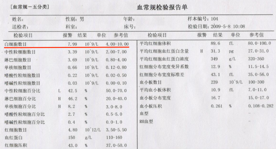 例如你在发烧的时候检查血常规,可以看看检验报告单上的白细胞数目。