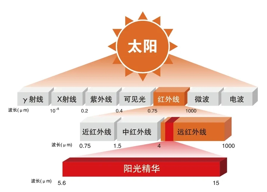 君康能阳光屋萃取太阳光远红外线中5.6~15微米的阳光精华,此段精华被称为“生命光线”,是人类赖以生存和维持健康必不可少的物质。