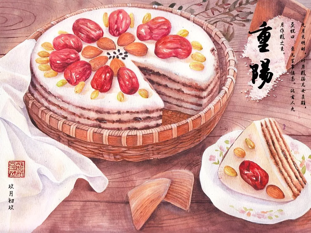 重阳节又被看作是敬老节,所以民间常常会制作重阳糕老孝敬老人,糕点中富含多种养生食物。重阳糕也称为花糕,其中除了糯米粉之外,还添加了粳米粉、瓜子仁、赤豆、核桃仁、绿豆、果脯、红糖和黄酒等。
