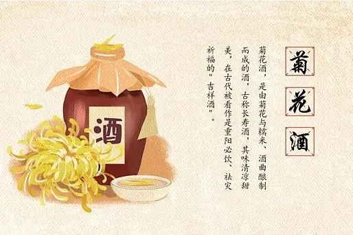 寒露与重阳节接近,此时菊花盛开,为除秋燥,一些地区有饮“菊花酒”的民俗,这一民俗与登高一起,渐渐移至重阳节。菊花酒是由菊花加糯米、酒曲酿制而成,古称“长寿酒”,其味清凉甜美,有养肝、明目、健脑、延缓衰老等功效。