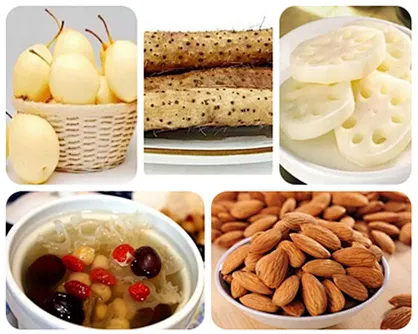 水果有梨、提子、荸荠、香蕉等;蔬菜有胡萝卜、番茄、冬瓜、莲藕、银耳等,以及芝麻、核桃、银耳、沙参、豆类、菌类、海带、紫菜等。