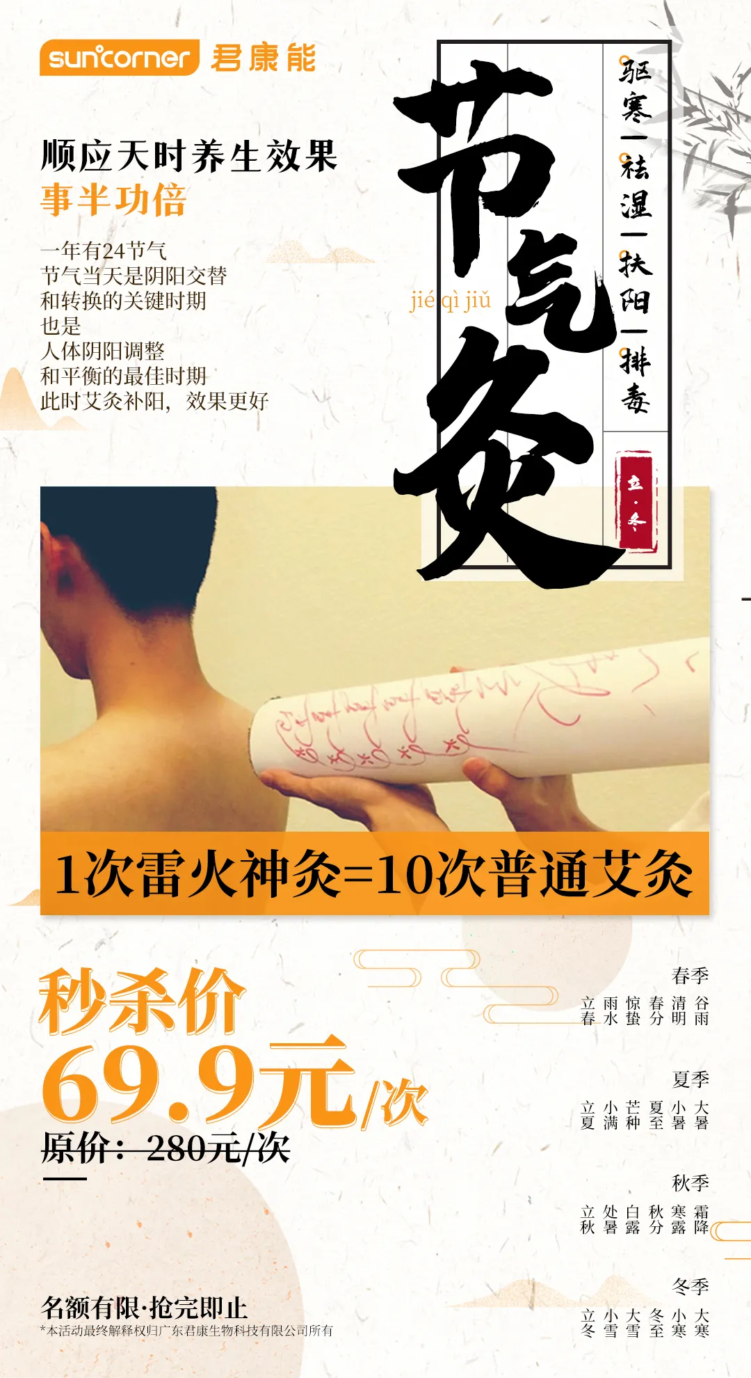 备注:“节气灸”活动仅限部分门店开展,活动详情请咨询君康能官方客服,咨询热线:400-860-2788。