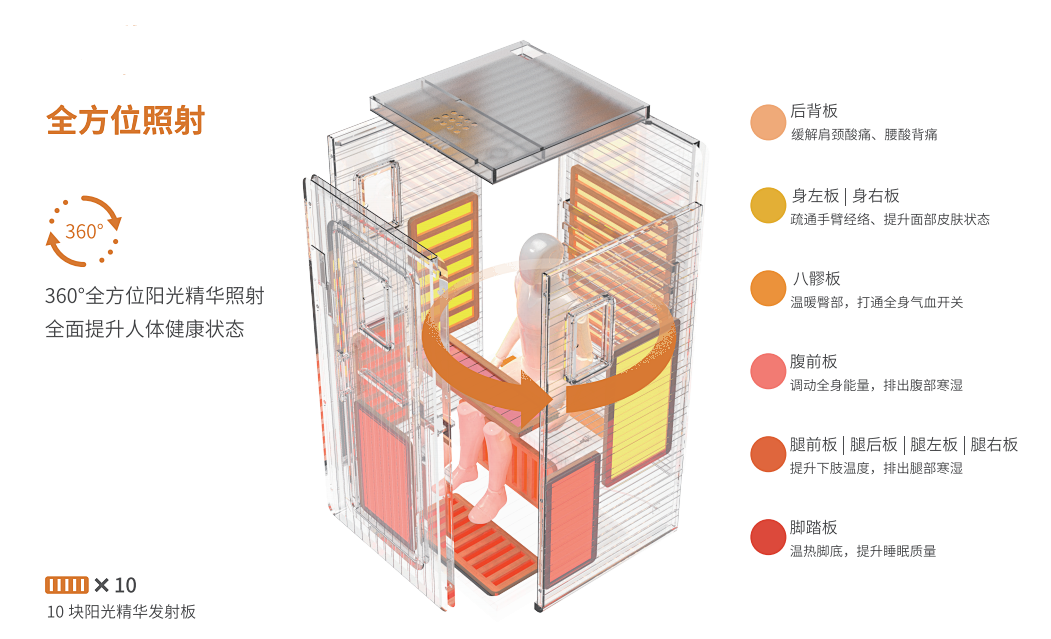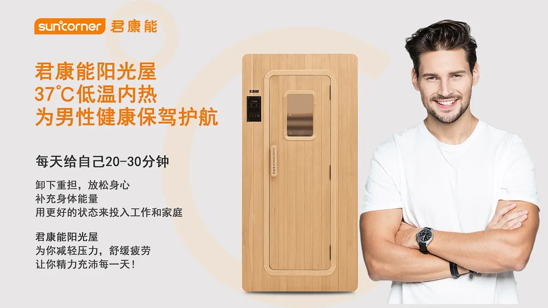 君康能阳光屋的10块阳光精华发射板,360°全方位照射人体各个部位,让男士们沐浴在温暖的阳光精华中,消除神经紧张和疲劳,缓解心脏压力。