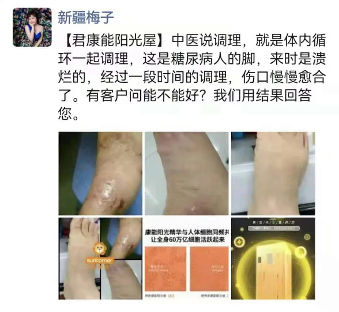 新疆君康能青年路店李梅店长在朋友圈分享,一位阳光屋家人患有糖尿病足溃疡,第一次来的时候脚部已经溃烂,经过一段时间的调理,伤口已经慢慢愈合。