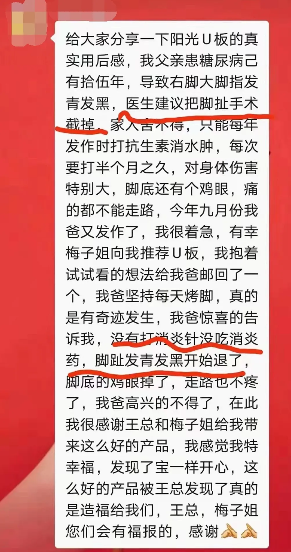 后来在新疆君康能青年路店李梅店长的推荐下,给父亲买了一块阳光U板,每天照射脚部。父亲每天坚持使用,没想到不用打针、不用吃药,脚趾的发青发黑开始退了,脚底的鸡眼也掉了,走路也不痛了。