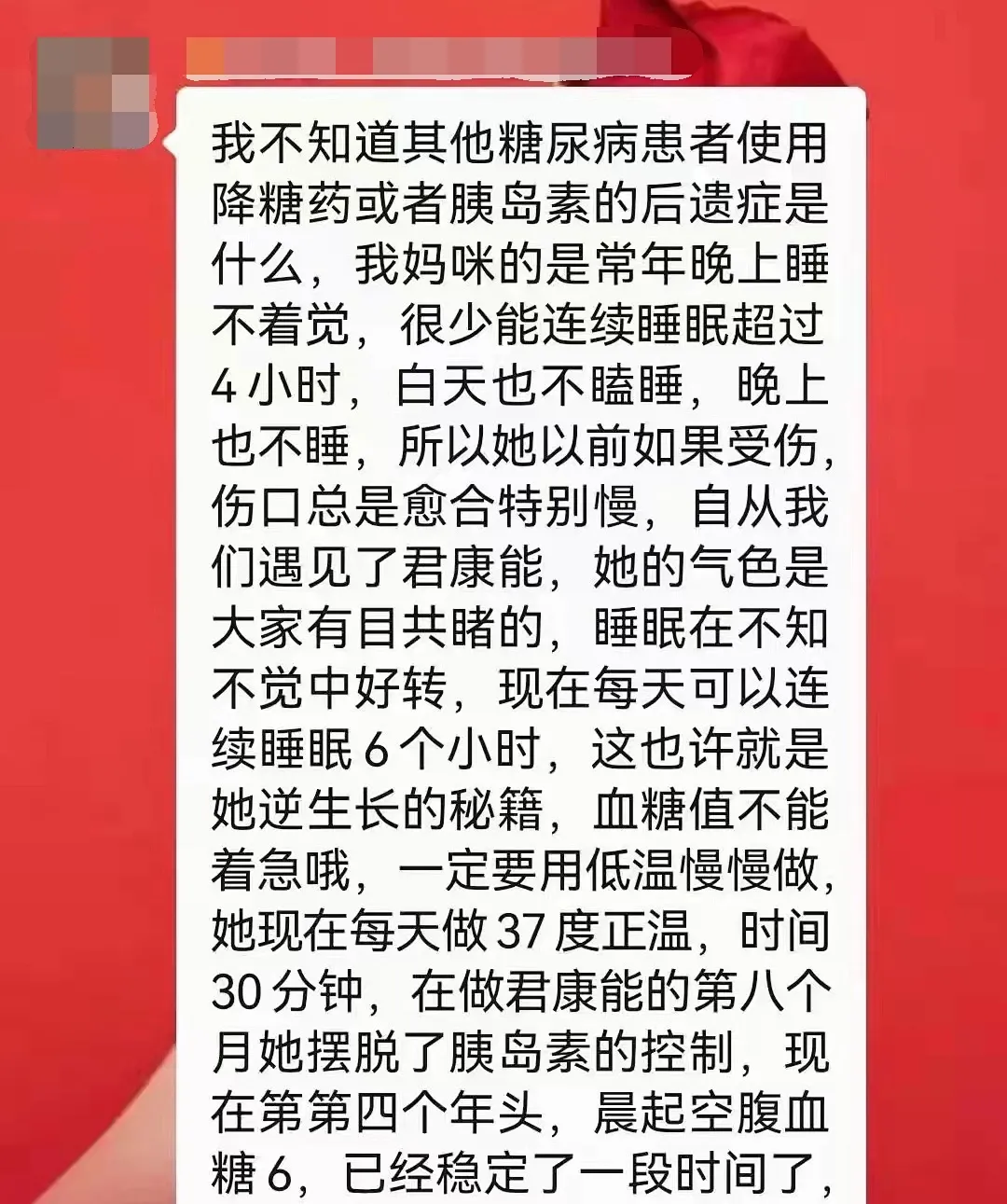 在阳光屋用户中,也有不少“老糖友”,他们也曾因糖尿病而深受痛苦,直到后来遇上君康能阳光屋,通过每天的坚持使用,糖尿病得到有效控制。