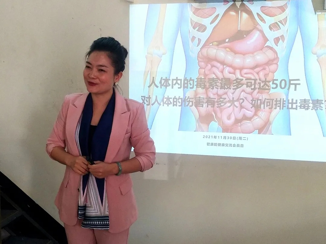 开心的抽奖和健康操过后,君康能总部市场部刘羽婷经理作为讲师,开始为大家讲解本期的健康知识——《毒素的危害有多大?如何有效排毒?》。