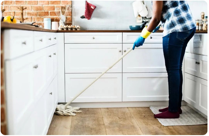 二、再把地下的垃圾、灰尘清扫干净,最后用地拖、抹布清理一遍,整个环境就变得干净卫生了。