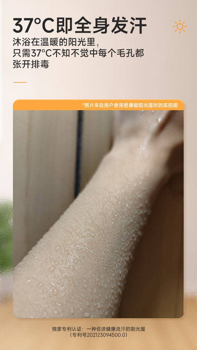 ▼君康能阳光屋,让你坐着就能轻松排汗!而且排出的汗,干爽不黏腻,没有气味。