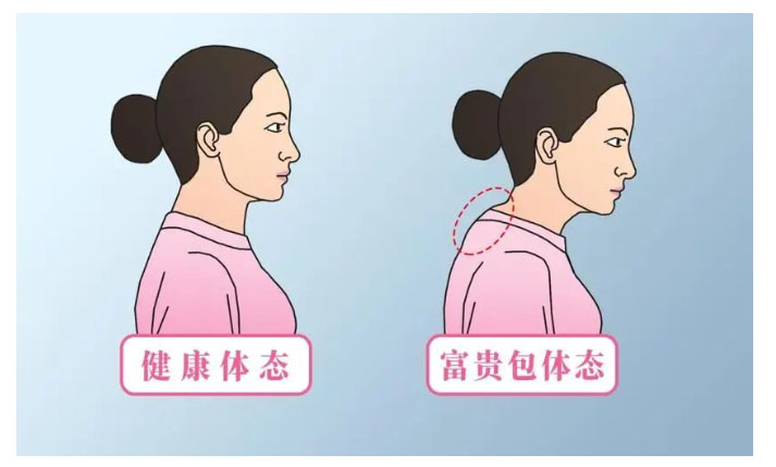 “富贵包”又称富贵背,它的临床表现是脂肪的堆积,身体的后背上部、颈胸交界处会有鼓起的硬包,也就是在第七颈椎与第一胸椎处的凸出硬包。