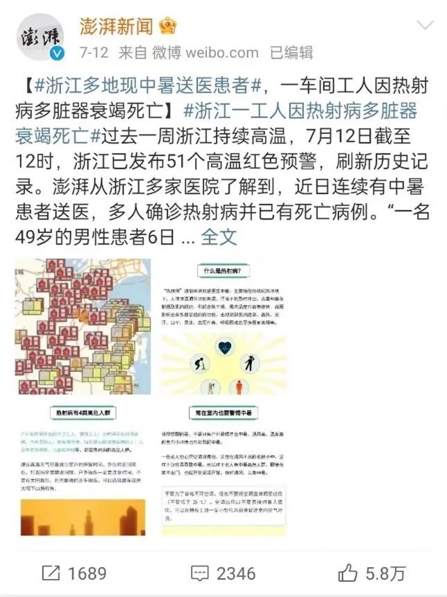 浙江省某医院近一周接诊3名热射病患者其中一位49岁工人在车间工作时昏倒,入院时体温40.7℃。