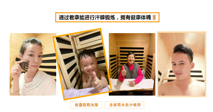 使用君康能阳光屋是锻炼汗腺的好方法。阳光精华渗透力强,直接作用于深层组织细胞,给细胞补充能量,再通过同频共振作用使身体产生温热效应,促进血液循环全身,并温暖体内深处,影响脑部的温度感受器运作,让身体排出“好汗”,使汗水有效蒸发,是调节体温的理想排汗状态。