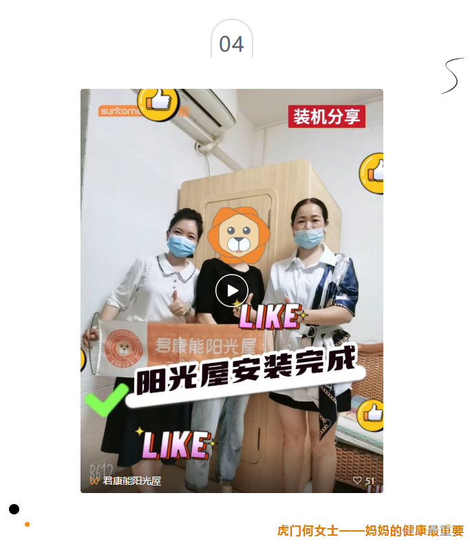 虎门的清姐,因为母亲使用君康能阳光屋半个月后改善了睡眠问题,就决定全款购机,把君康能阳光屋搬回家,让母亲可以每天使用。
