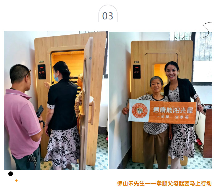 佛山的朱先生听母亲说,“使用君康能阳光屋后整个人舒服多了,脚也没这么痛了”,便马上让表姐帮他也买一台放家里,给母亲每天使用。