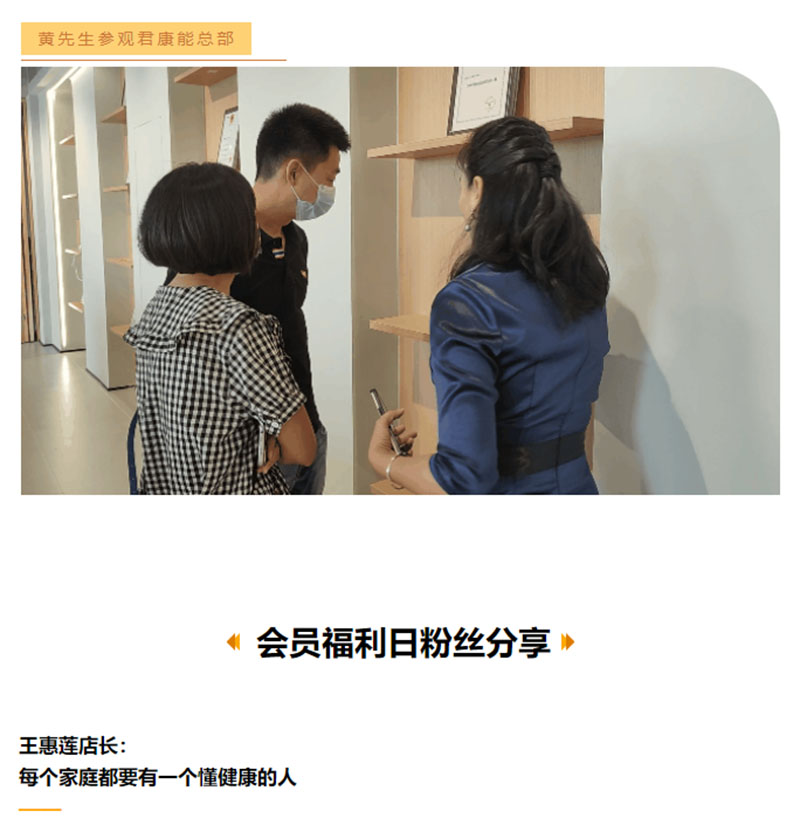 本期会员福利日,新加入了一位粉丝黄先生。黄先生之前意向为母亲购入一台君康能阳光屋调理身体,当天也是特意过来参加会员日,希望深入了解君康能品牌和主打产品——君康能阳光屋。