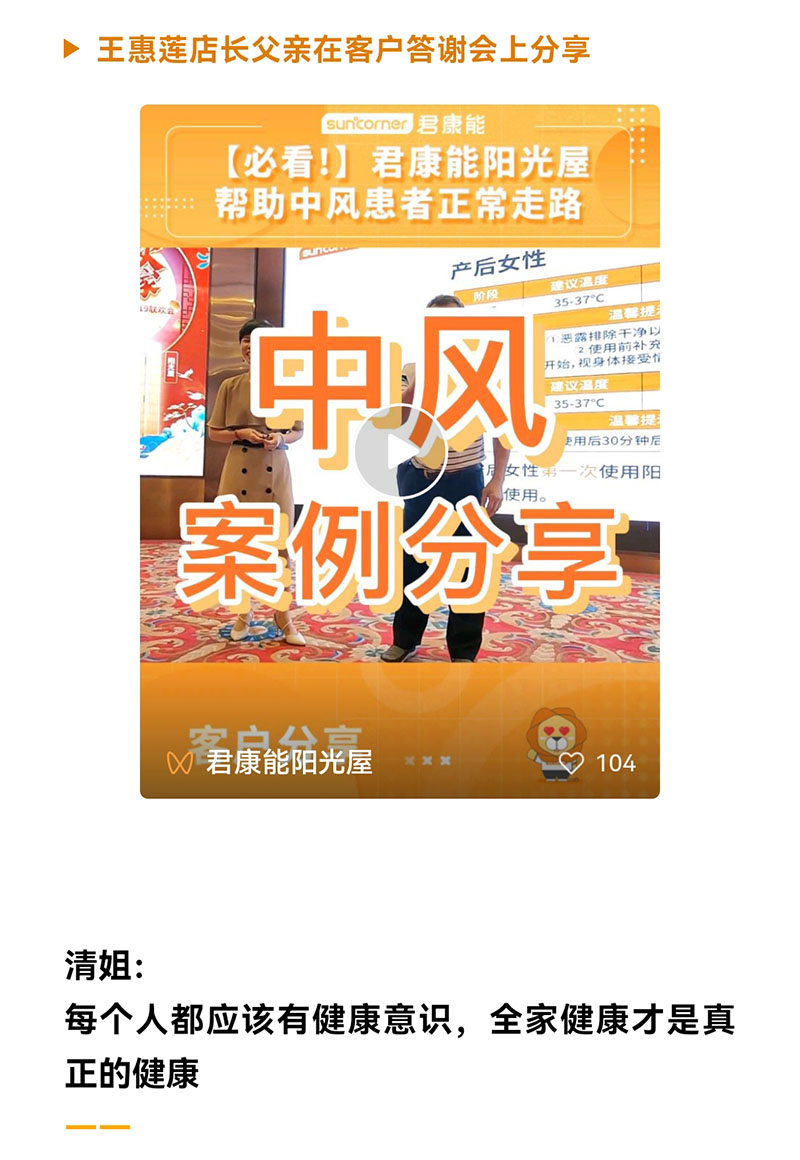 王惠莲店长分享到,她的父亲几年曾经中风,之后走路、说话都不太利索,再加上父亲本来就有三高,这让她心里很不是滋味。为了让父亲好好调理身体,她送了父亲一台君康能阳光屋。