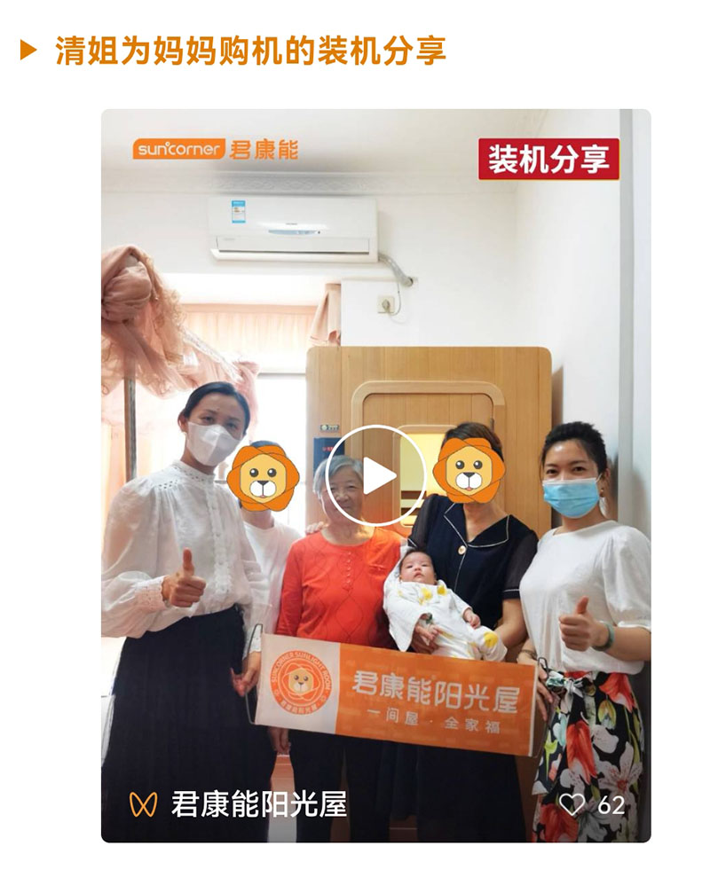 看见妈妈和弟弟一家人用的效果那么好,她也复购了一台君康能阳光屋放在自己家里,让一家人享用,因为:“全家健康才是真正的健康!”