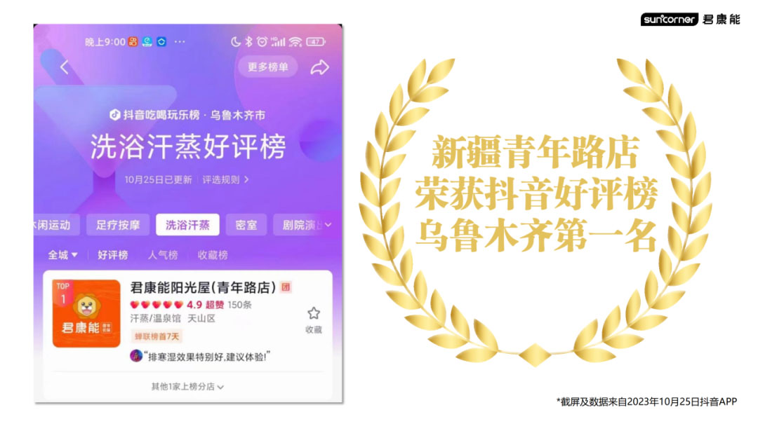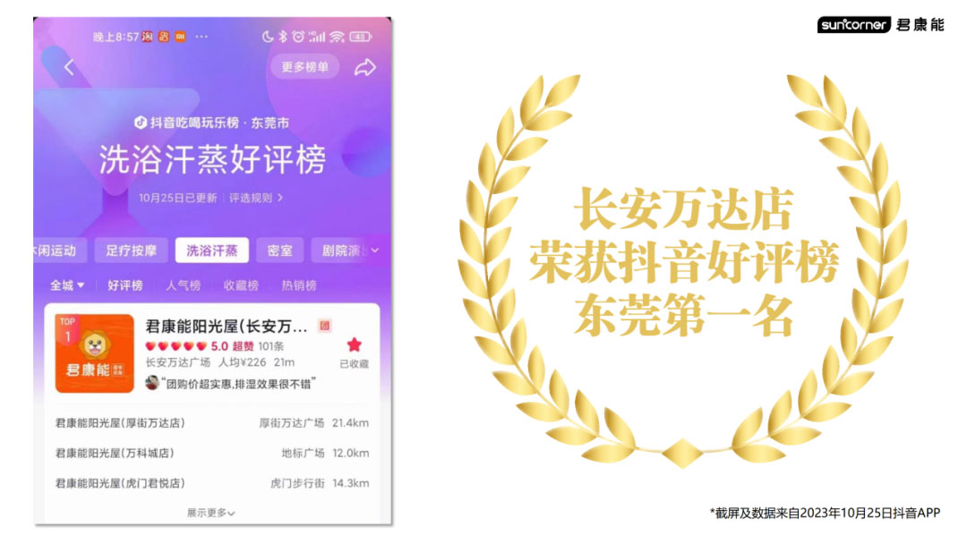 君康能公司在东莞地区成功布局了十多家直营店,并开展了抖音、美团等线上营销推广活动,从而逐步提升公司的知名度。东莞长安万达店和新疆青年路店分别名列东莞及乌鲁木齐抖音好评榜第一名!