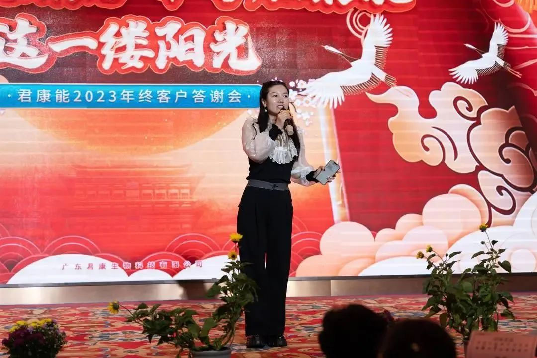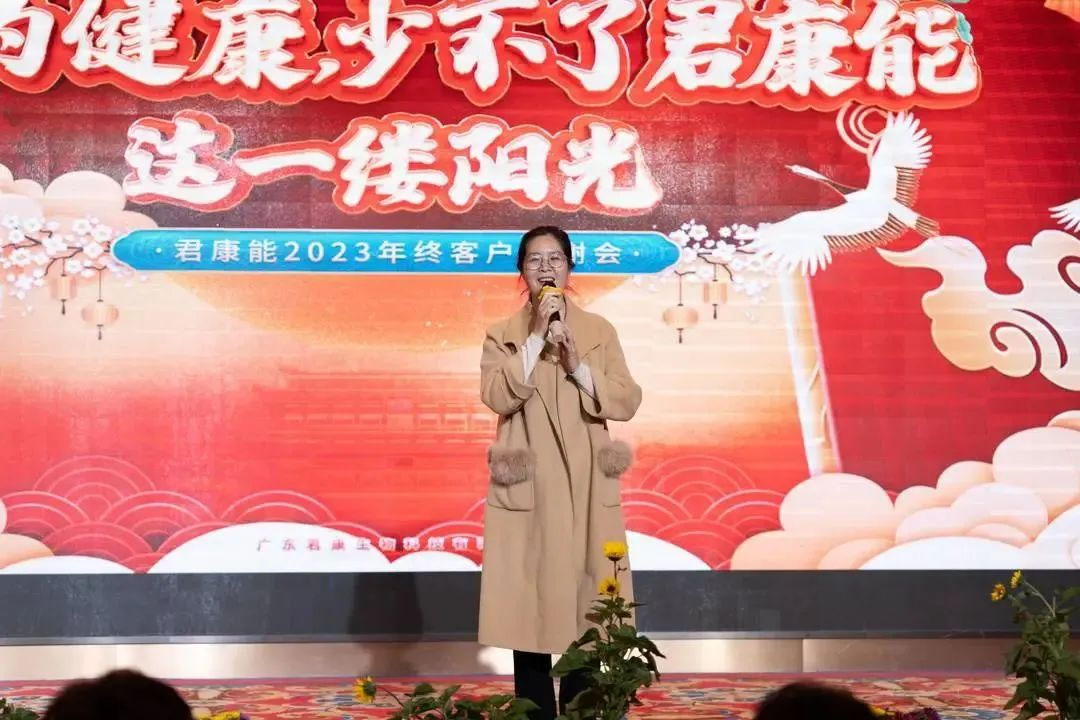 在愉悦而和谐的氛围中,广东君康生物科技有限公司董事长梁凤玲女士发表了致辞,并向在场的宾客表达了诚挚的祝福。